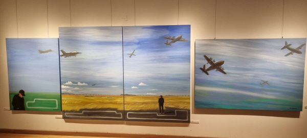 ‘봄을 기다리는’ 제호의 작품은 120호 3개 연작이다. 겨울은 가고 봄은 아직 오지 않은 어느날, 동백은 처연하게 떨어져서 주변을 붉게 물들였다. 거름 냄새가 심한 배추밭과 무밭, 진흙탕길을 지나니 우뚝 솟은 제주의 대정읍 알뜨르 비행장 격납고가 눈에 들어왔다. 일제 강점기의 흔적이다. 여기저기 흩어진 흙무더기가 예비검속으로 끌려가 처형된 장소라고 한다. 나는 한참 동안 그 자리에 우두커니 서 있었다.