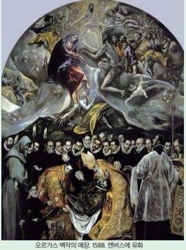 ‘오르가스 백작의 매장’은 엘 그레코의 가장 유명한 작품이다. 하단에 죽음을 맞이한 백작을 두고 천상과 지상으로 나누어진 세계를 하나의 화폭에 연출하여 신비적 세계를 시각화 하였다. 길게 왜곡된 인체와 빛과 어두움의 극적 대비를 통해 신비적 분위기를 표현하려고 한 것을 특징으로 볼 수 있다.