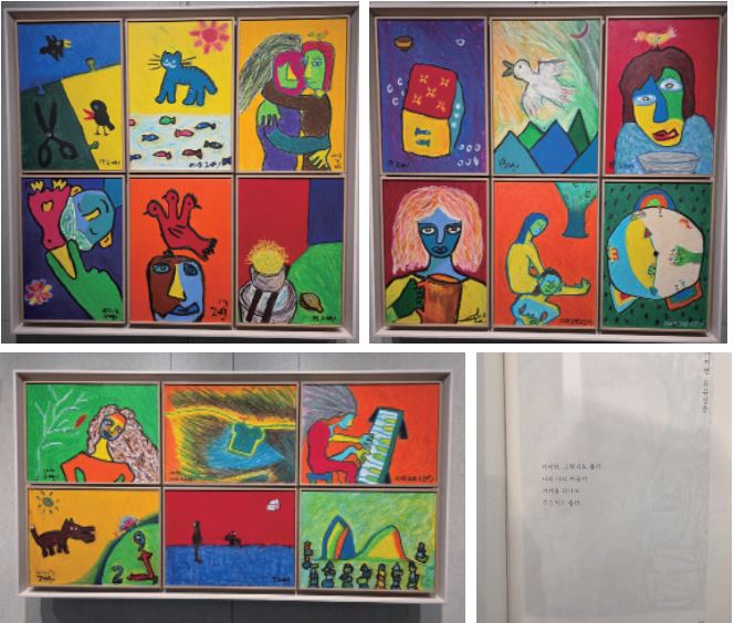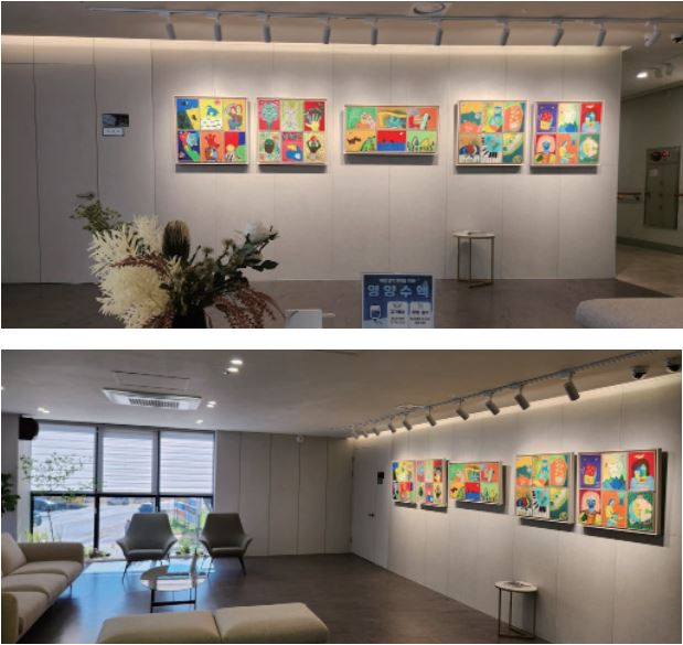 김정배 작가의 작품은 크기가 작고 형태도 단순하지만, 그 안에 담긴 감정은 결코 가볍지 않다. 여섯 점의 그림을 한 액자에 담아 구성한 옴니버스 작품들은 작은 장면들이 모여 하나의 이야기가 되는 방식이다. 전시장에서도 이 작품 앞에서 가장 오래 머무는 사람이 많다. 이번 전시를 기획한 이음예술문화원은 그림이 병원이라는 장소와 자연스럽게 어울리길 바랐다. 그림이 꼭 미술관에만 있어야 하는 건 아니다. 누군가의 하루를 지나가는 길목에 있더라도 충분히 제 역할을 할 수 있다고 본다. 기획자는 작품을 걸며 그런 생각을 더 확신하게 되었고, 사람들이 진료 대기 중에도 그림 앞에서 한 번 더 시선을 두고, 시집을 넘겨보는 모습을 실제로 보았기 때문이다.