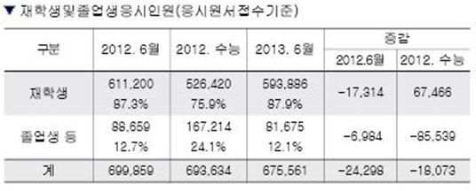 올해 2013학년도 입시에서 수험생 숫자는 전체적으로 줄었다. 수험생들에게는 조금이나마 희망적인 이야기가 된다. 왜냐하면 수험생이 줄면 경쟁률도 그만큼 내려갈 수 있기 때문이다. 다음 두 개의 표를 잘 살펴보기 바란다.