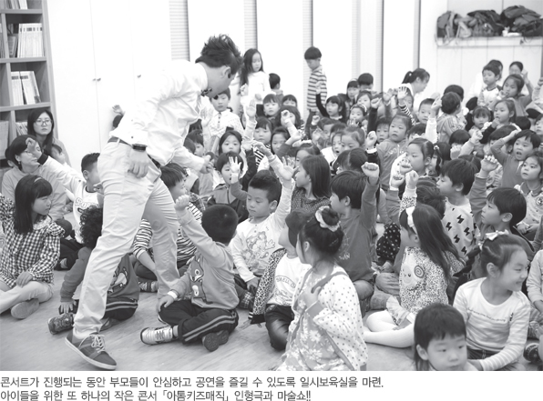 한편 콘서트가 진행되는 동안에 부모들이 안심하고 공연을 즐길 수 있도록 마련된 일시 보육실에서는 취학 전 어린이 300여명이 마술쇼와 인형극을 관람하고 다채로운 프로그램에 참여하였다.